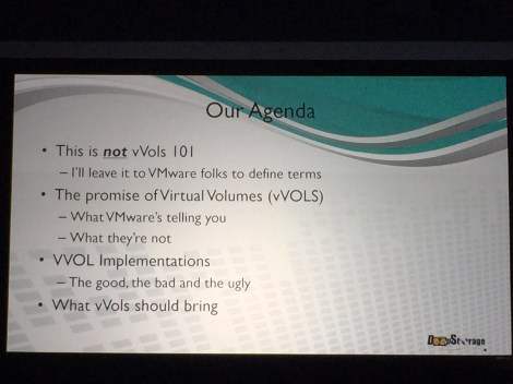 So onto the event, this morning I started off with attending @deepstoragenet‘s session Putting Virtual Volumes to Work – Storage Best Practices for vSphere 6 and Beyond #STO5822 which I found to be really valuable, Howard went into some detail about what vVOLs brings to storage and he offered some great advice on what questions you need to ask your vendors when looking for features.