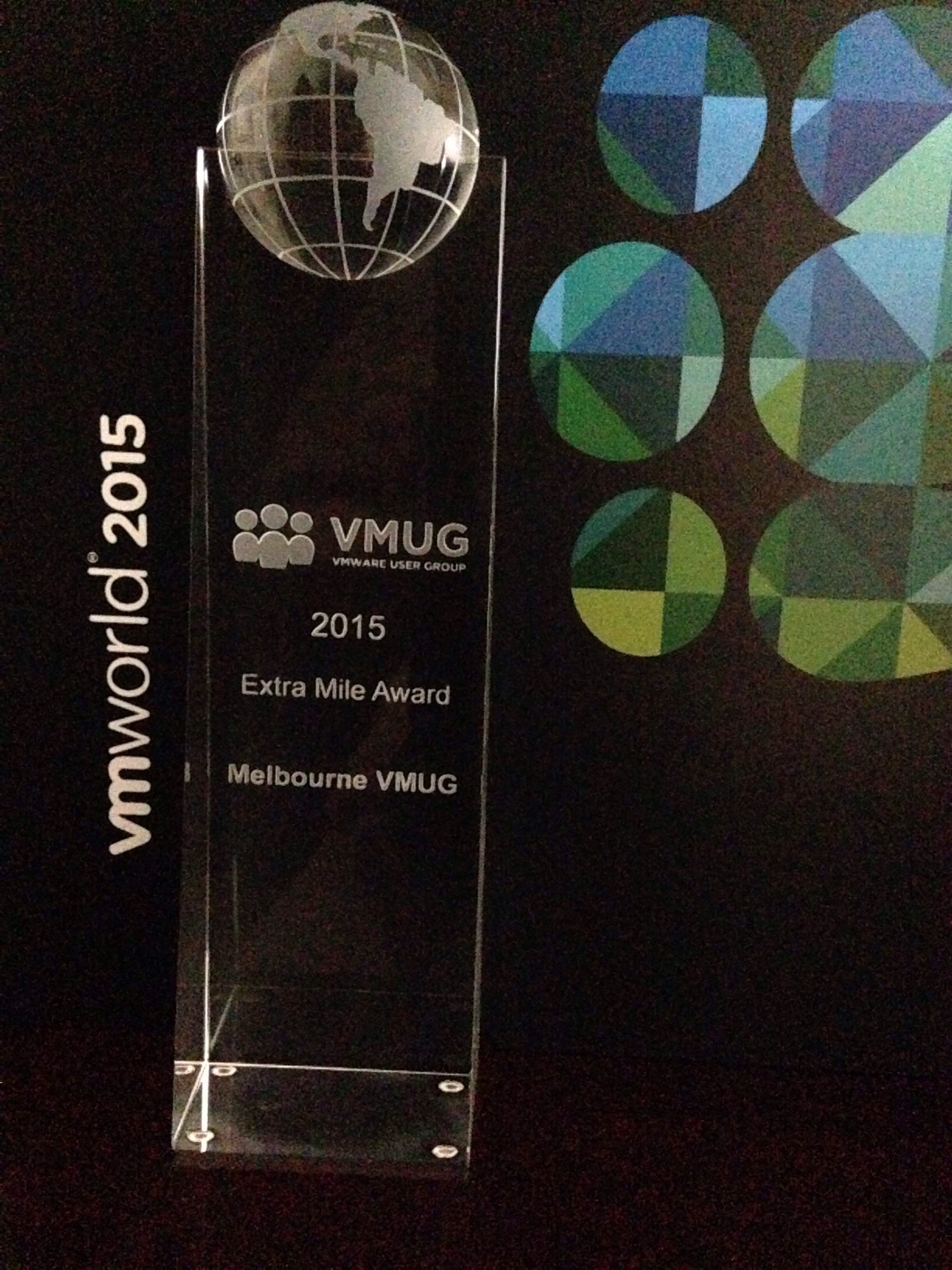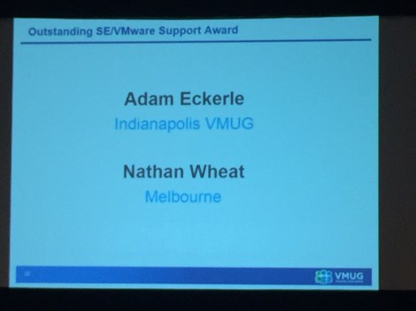 Each year the VMUG awards it’s Leaders for their contribution to the VMUG community and this year we came away with 2 awards (w00t) The Extra Mile award (Melbourne VMUG @mvmug) which myself and @daunce_ picked up and the Outstanding SE/VMware Support Award which was awarded to @wheatcloud, well done mate and thanks for your continued support!