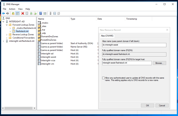 Intersight Assist also requires a CNAME with dc- added to the beginning referencing the A record created above (e.g. dc-intersight-assist.flashstack.int)