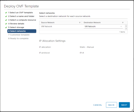 On the Select networks page, for each network that is specified in the OVF template, select a source network and map it to a destination network and click Next.