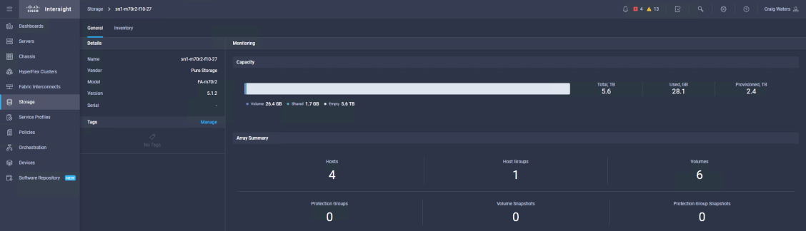 Finally you can select a FlashArray and obtain an overview of the inventory of the FlashArray from within Intersight.